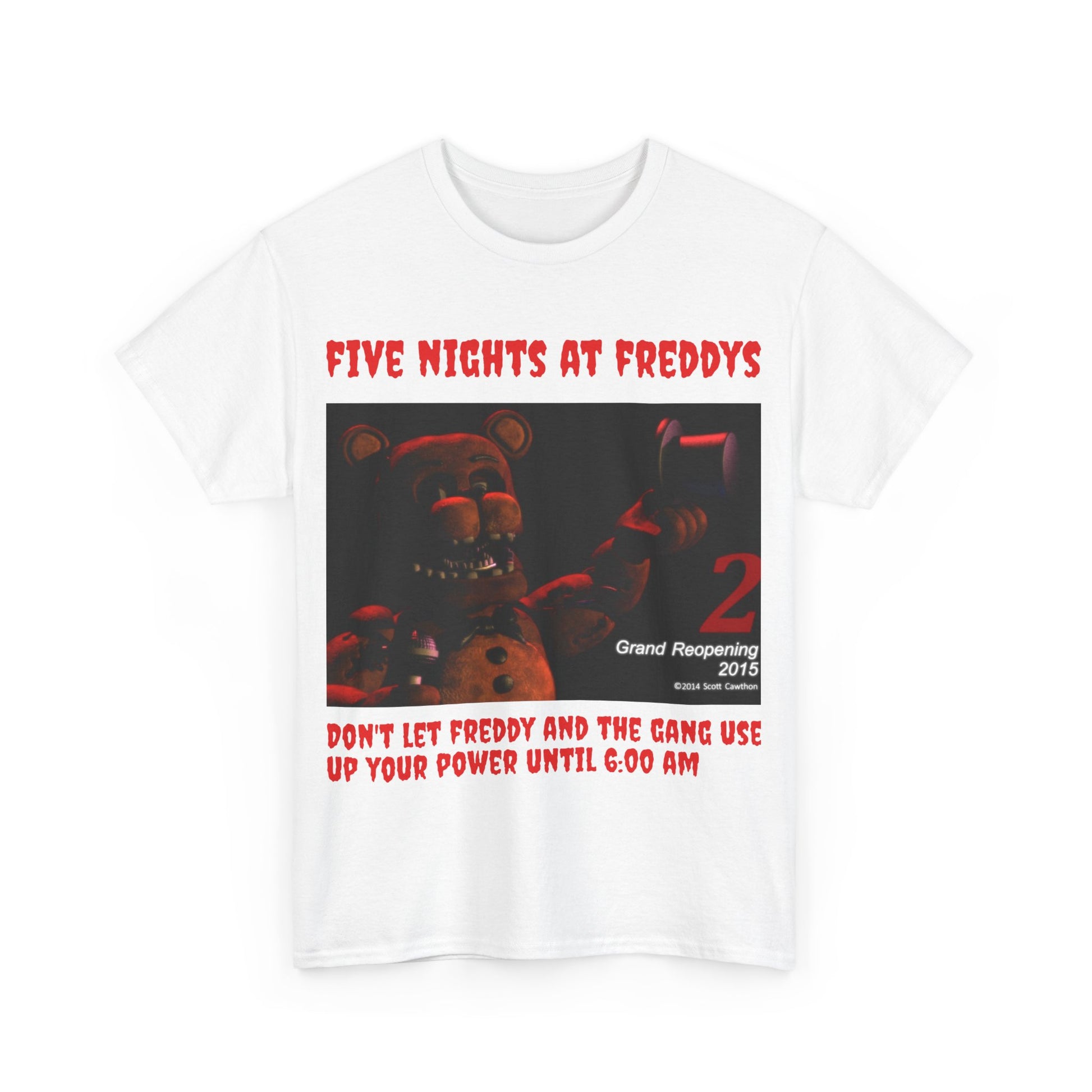 This FNAF themed T-Shirt features the message 'don't let freddy and the gang use up your power until 6:00 am'. Perfect for fans of the game looking to showcase their love for the characters. The classic fit and comfortable fabric make it ideal for casual wear or as a statement piece in a semi-formal outfit. Suitable for adults and made with high-quality materials for durability.